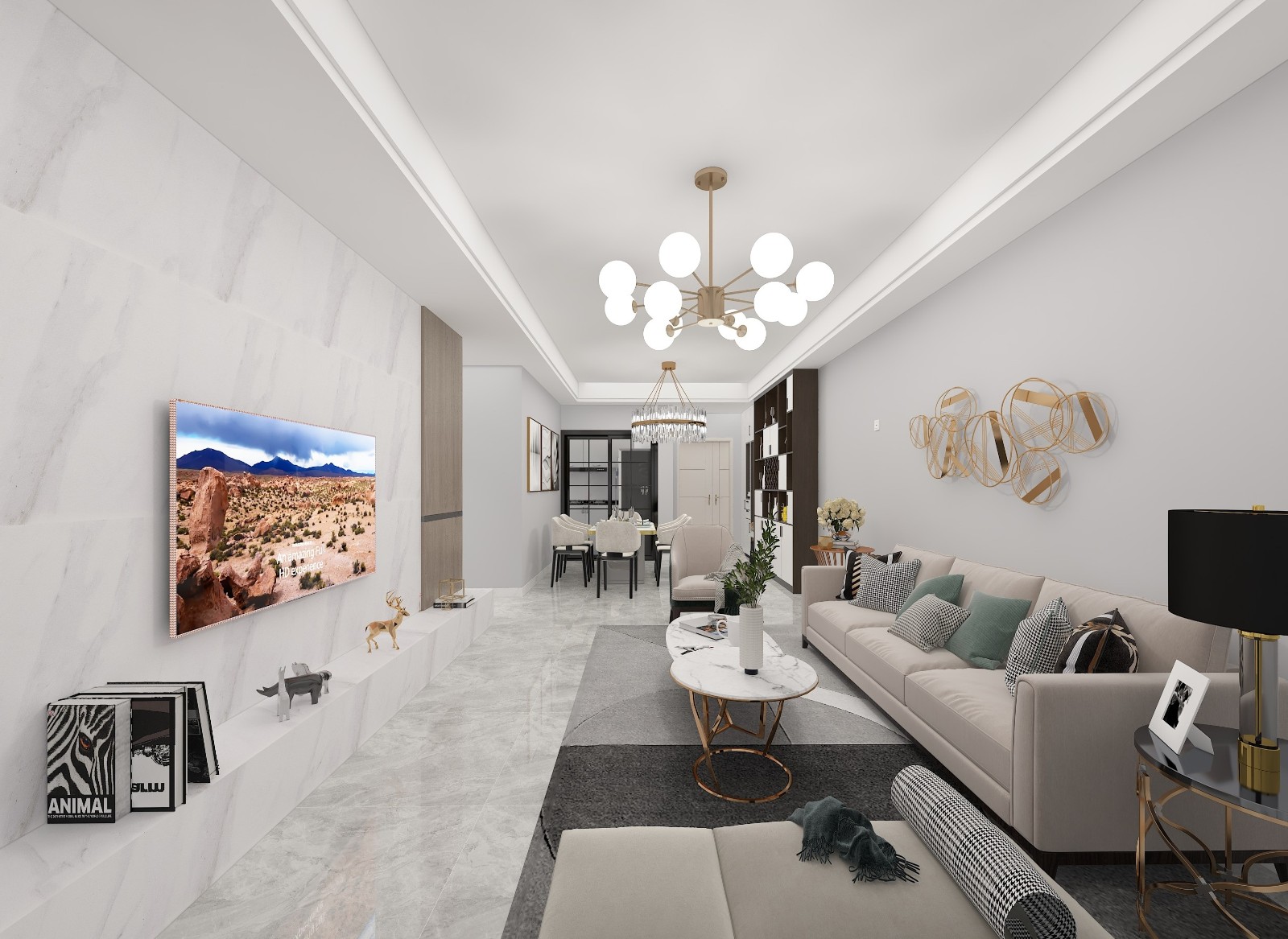 一体化客餐厅的优点是能够充分利用空间,减少压抑感与拥挤感,打通视野,获得更好的视觉效果。