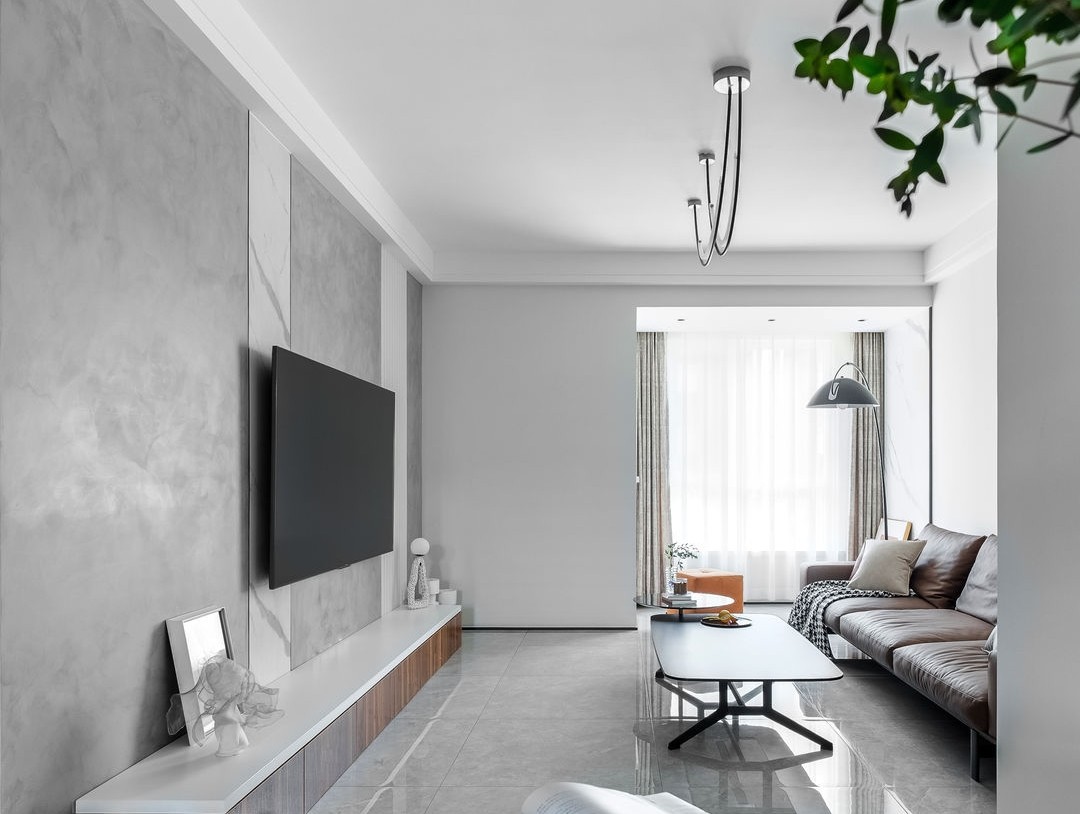 客厅一眼望去就是***灰的感觉,充分利用了窗外的采光,电视背景墙和地砖不同明度的灰色,让空间层次感分明。现代感造型的吊灯为简约的吊顶增光添彩。