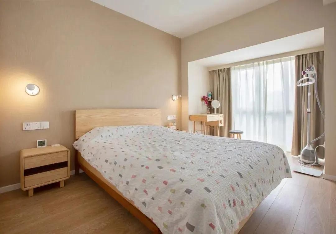 主卧以暖白色调为主,搭配原木组合家具,素净自然、淡雅而不单调。