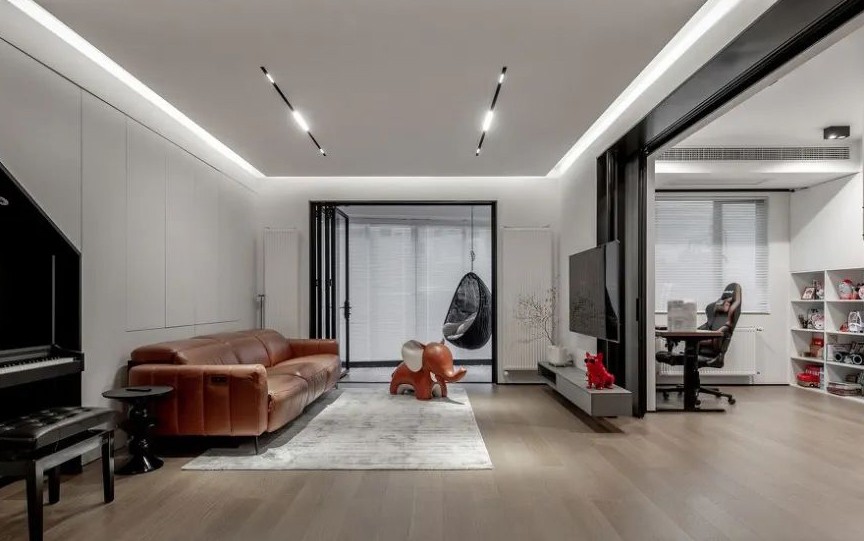 客厅沿着入户进门右转就到了,硬装上,最吸引人的便是四周留槽,嵌入灯带的悬浮式吊顶,结合无主灯设计,看着干净利索的同时,又显得特别的极简。