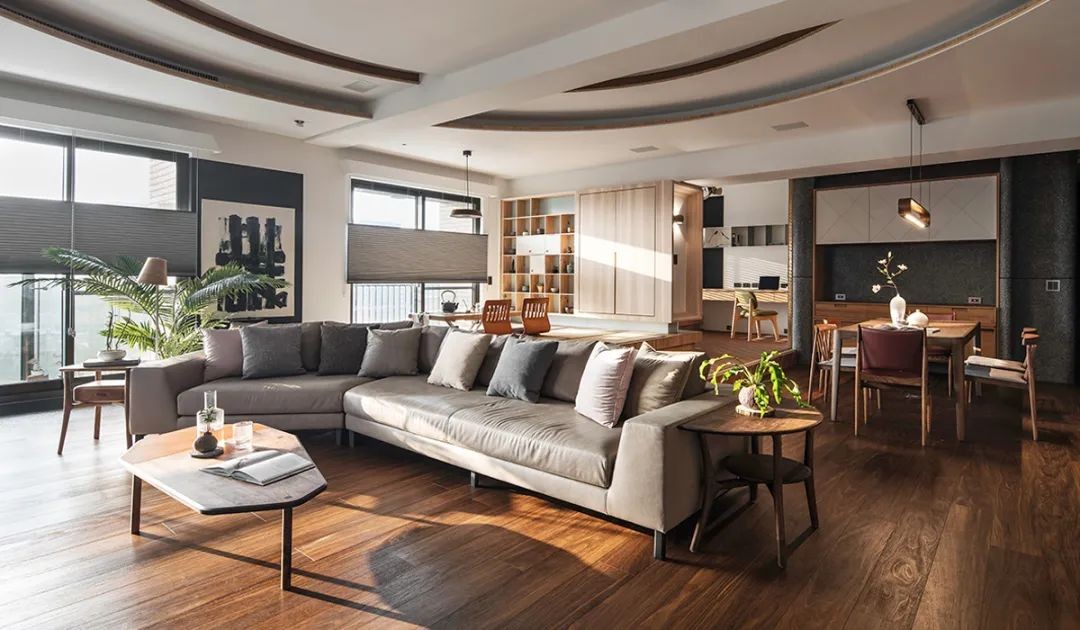 天花犹如雨点坠入平静的池水之中 戏剧性地激起皱褶,而木地板兜成一圈 成为客厅这一片涟漪的边际,层层完整了圆弧空间