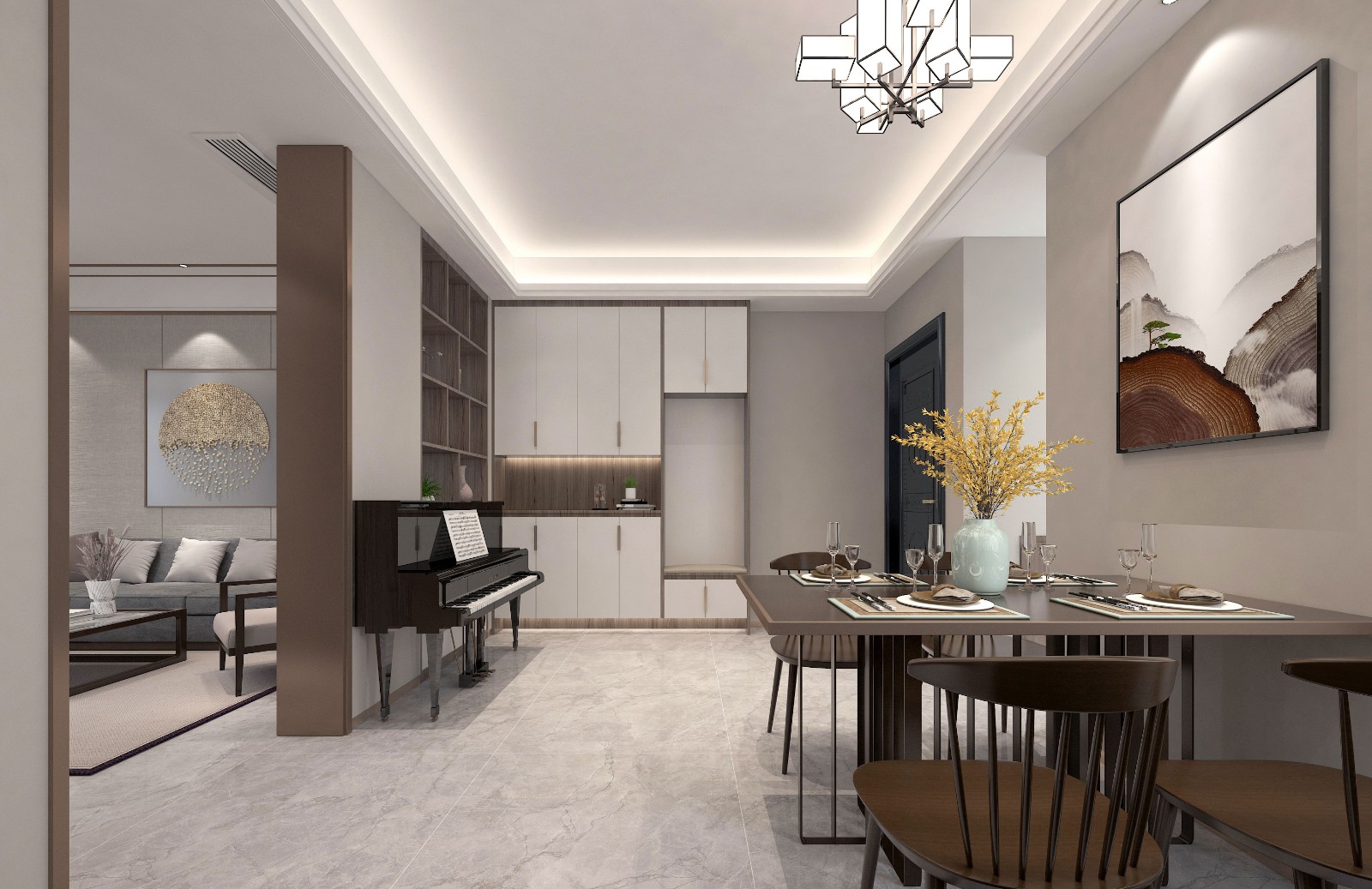 业主陈先生有两处房子,恰巧为楼上楼下同户型,此方案为4楼,以新中式为主,做日常接待及一家人休闲之处