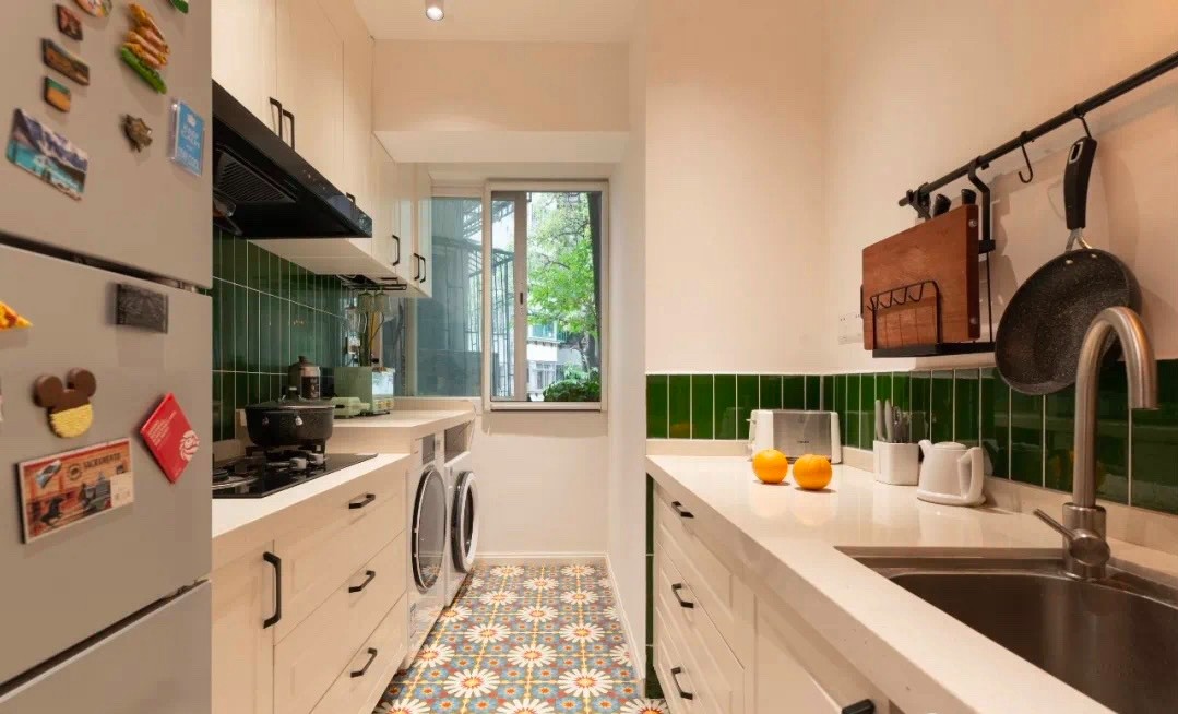 II型的厨房设计,动线合理,一侧是洗切专用,另一侧是烹饪区;两边的收纳柜,足以放下厨房各种小家电;洗衣机、烘干机内嵌在橱柜里,一切都非常的井然有序。