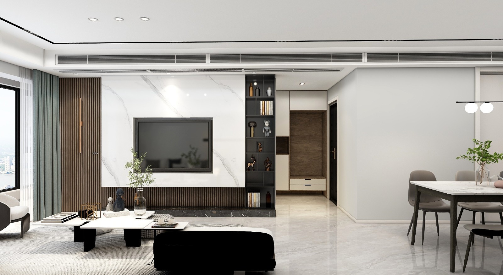 现代简约风格运用时尚新颖的材质,突显现代的结构美,打造更有时尚,充满品味以及高雅的现代家居空间,比如玻璃、镜面、木质材质以及马赛克等一些新颖材料,整个客厅干净利落又整洁,又有立体感。地面材料选用高当的大理石,或者浅木色的木地板
