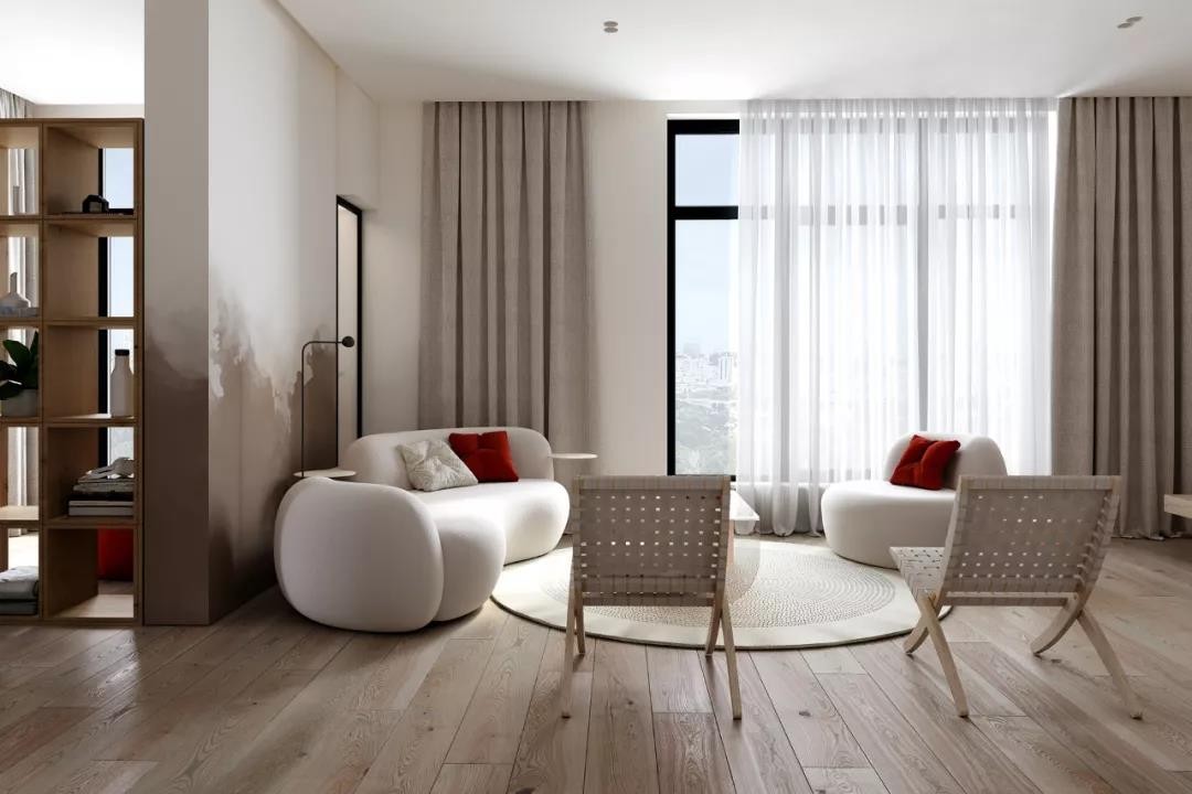 弧形的白色沙发 搭配渐变色的透明茶几与圆形地毯 整个画面极具艺术气息