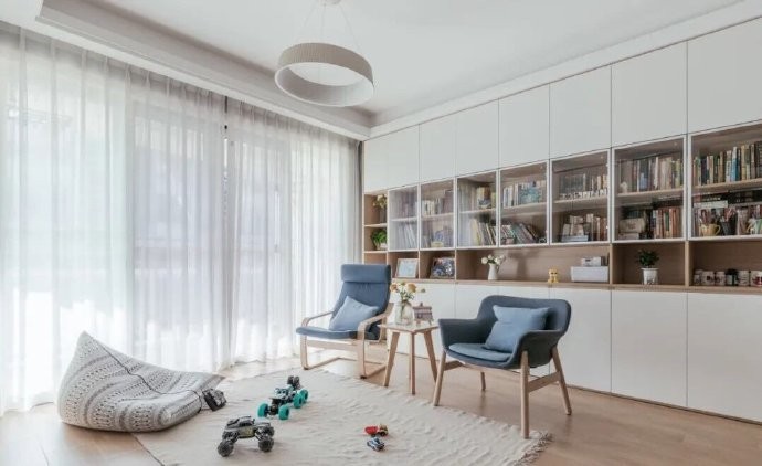 地毯堆放儿童玩具,豆沙袋慵懒却很接地气,书柜做玻璃门处理,内涵提升的同时也起到装饰作用。