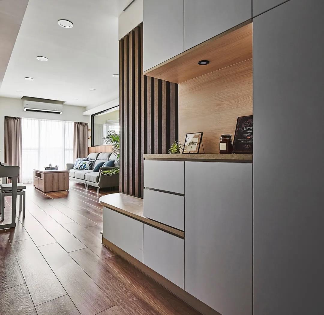玄关运用顶天立地鞋柜 整合一家人鞋履,选用浅木色柔和白色层板堆迭视感并延伸一道圆弧收边穿鞋椅