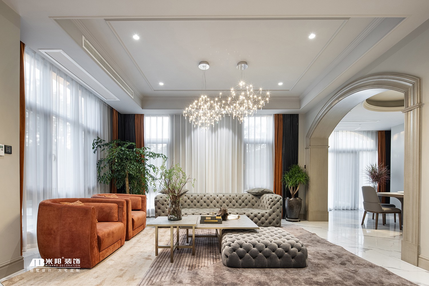 客厅设计了全敞开的社交来融合房子的体量感,地面采用鱼肚白的大理石砖铺设,墙面则以艺术漆喷绘,半灰的沙发和地毯,设计极具艺术感。