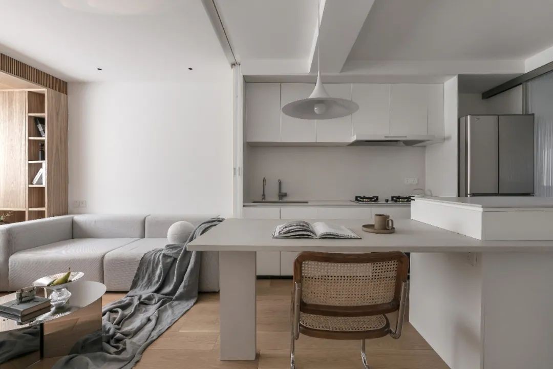 客厅内开放式厨房与岛台餐桌相结合,兼顾洄游动线的操作便利性。