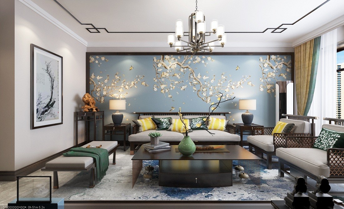 沙发背景墙用中式梅花刺绣做装饰,搭配台灯点亮古色古香的客厅一角