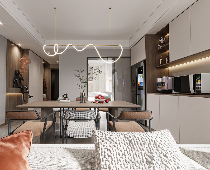 进来就映入眼帘的电视墙,以及法式轻奢的必备地毯。再加众多的油画装饰,带来新古典主义的低调和北欧风格的沉静。