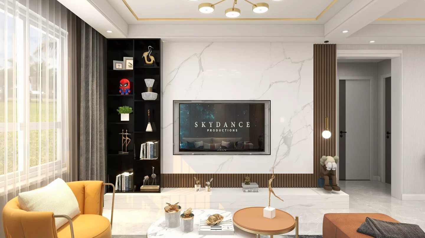 电视墙的两侧设计了几排展示柜,大理石材质的电视墙,搭配着木质的展示柜,让整个客厅显得特别的生动.