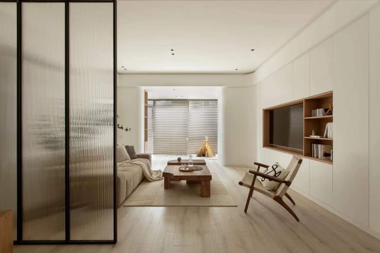 电视墙只做了较薄的电视柜满足简单的收纳需求,使电视柜和墙面在同一水平线。