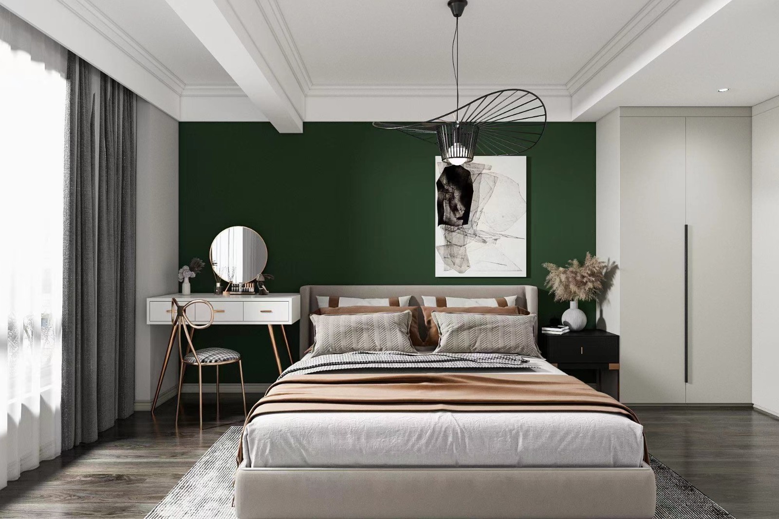墨绿色的床头背景和梳妆台圆镜的搭配很协调