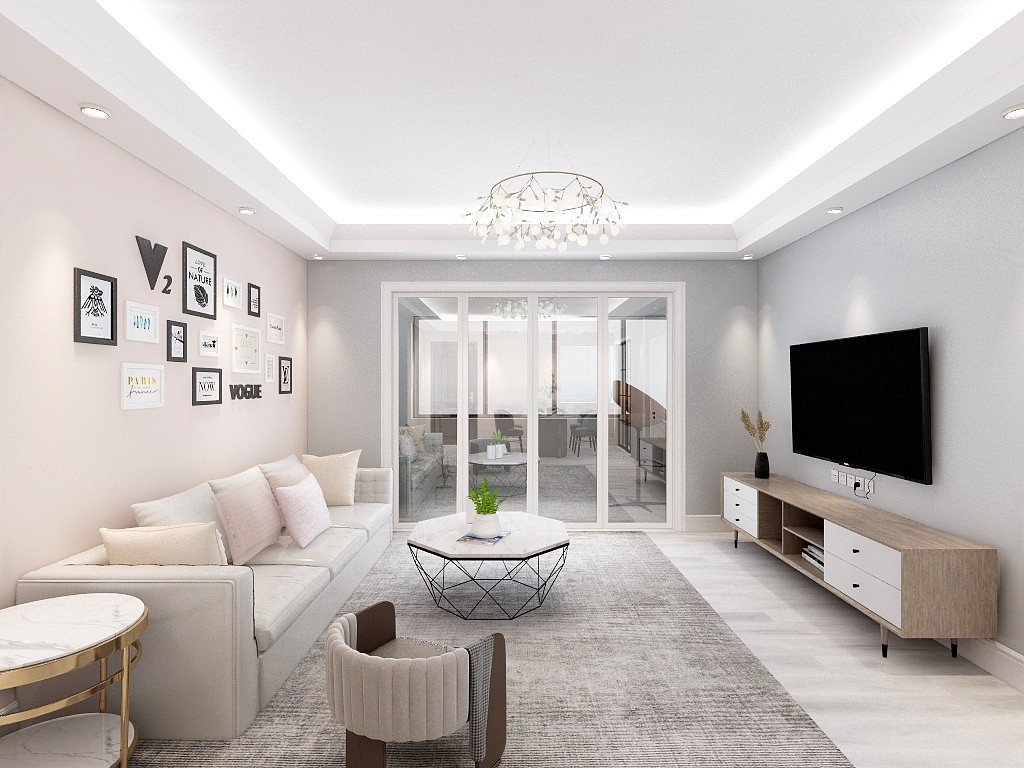 充满时尚感的艺术吊灯下,米白色的布艺沙发搭配白色大理石茶几,营造出静谧而又美观的居家空间
