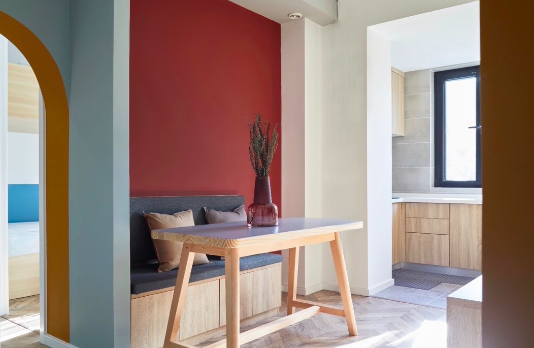 卡座+长桌的布局形式,有效的节约了空间,大长桌可以舒适的容纳四人就餐,偶尔爷爷奶奶来看孩子,也足以在家吃一顿团圆饭