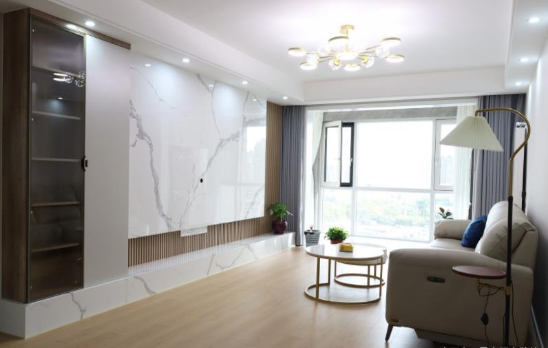 电视墙的部分运用比较流行的白色大理石背景,搭配木格栅和左侧玻璃和木质展示柜,使空间得到延展,立体形态有条不絮、有节奏的线条融为一体,设计别有一番滋味