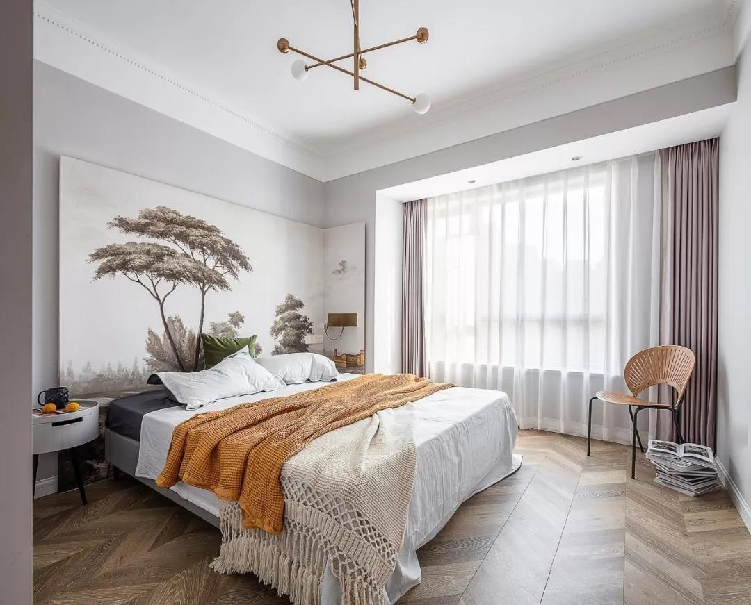 主卧的主题色彩更加轻松明快,大面积的浅灰色墙面和鱼骨拼地板,更加富有质感,暖橘则作为一抹跳色,点亮整个卧室空间