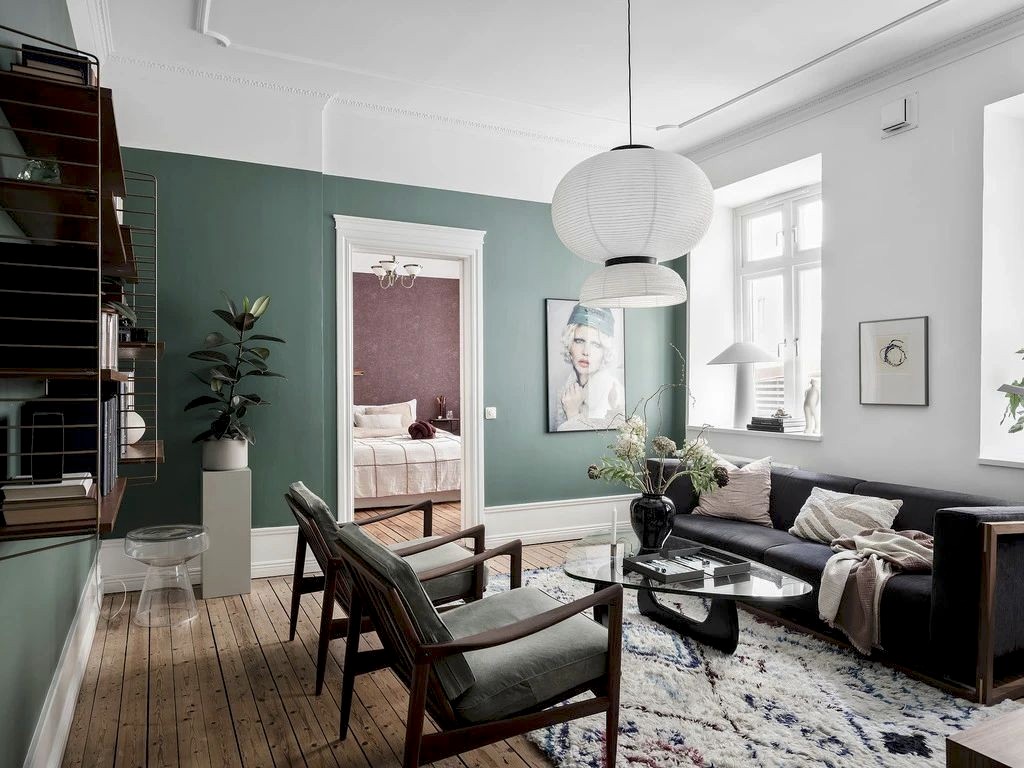 客厅两扇高大的窗户可以让光线进入,带有漂亮的深窗窗台,方便放置一些绿植摆件;深绿色的墙面搭配深棕色的家具,质感满分