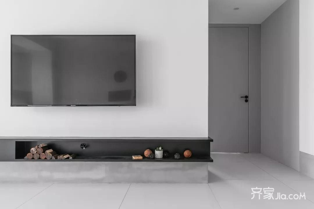 黑色悬空电视柜让整个空间沉稳了,简单的电视背景墙更简单