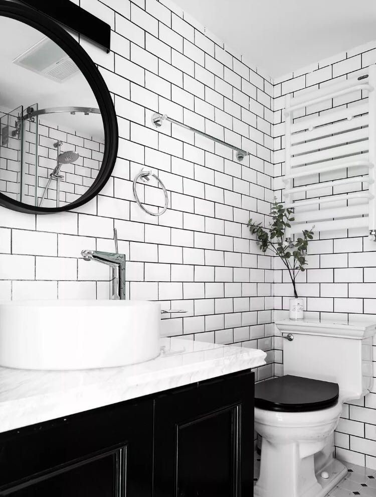 卫浴间的采光不太好,所以卫生间也是大面积使用面包砖,加入黑白图案在灯光作用下透出硬朗的工业风气质,带来强烈的视觉冲击力