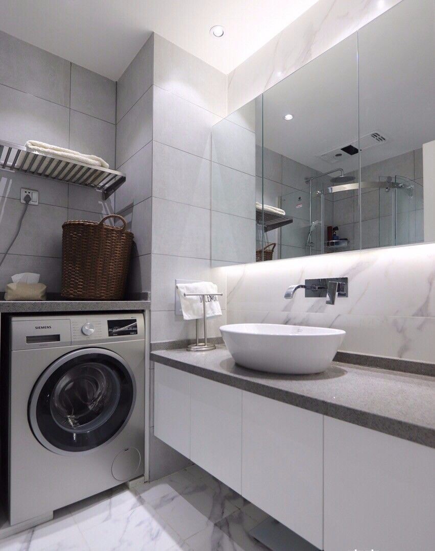 浴室柜采用挂墙设计,视觉上更干净卫生,打扫起来也更方便,洗衣机上方设置了料理台面,脏衣篮更方便收纳换洗衣物