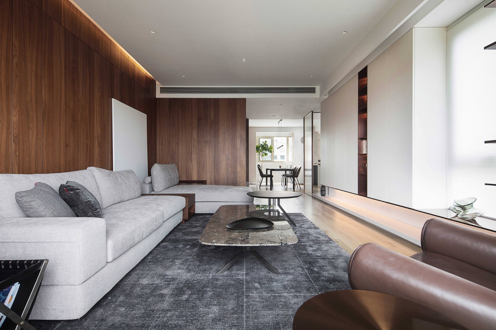 客厅大面积温润低调的胡桃木,为简约的现代家注入无限温柔。柔软的布艺沙发、皮质扶手椅、岩板茶几,材质的融合碰撞,营造空间的秩序感和节奏感