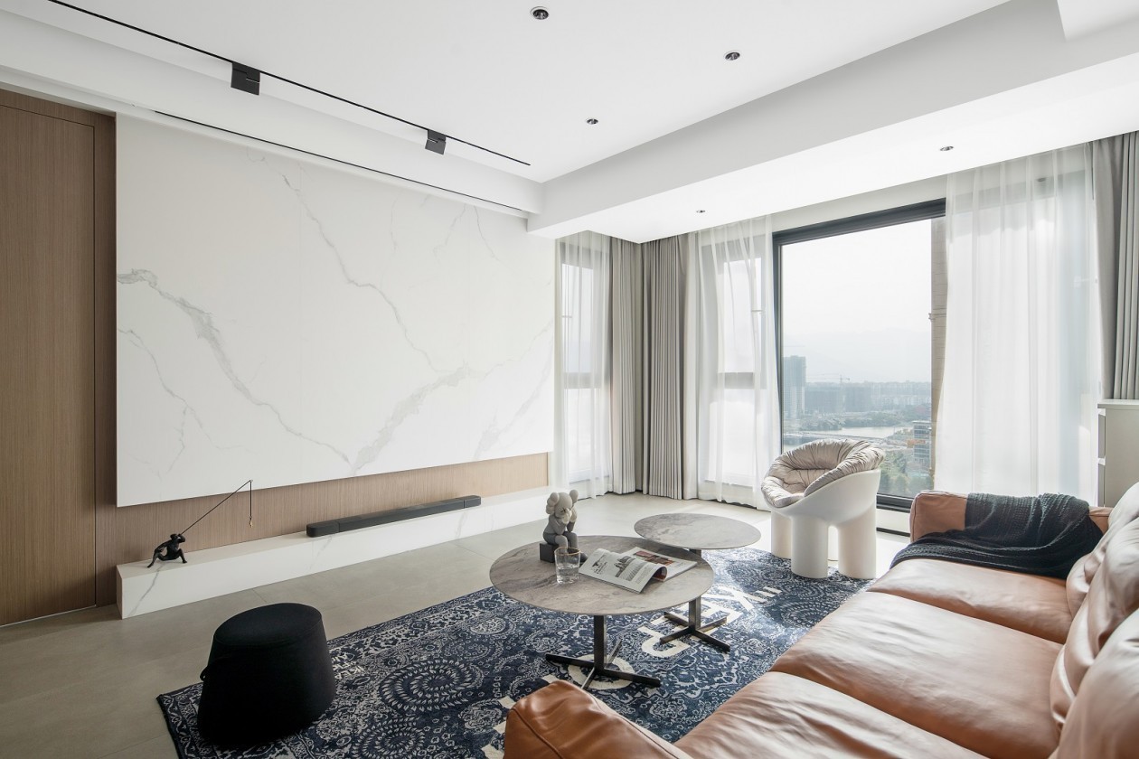 本套案例中用银梨色木饰面、鱼肚白岩板、白***术漆构成整个空间, 让客厅整体实现一种一尘不染的气息。