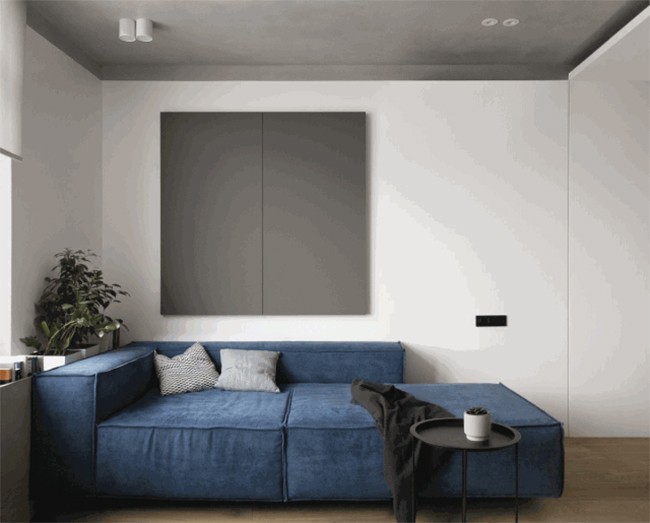 客厅选用木地板 与厨房、餐厅做分隔 蓝色的双人沙发靠墙摆放 沙发上的灰色柜门既可以作为艺术装饰 也掩藏了户型的缺陷