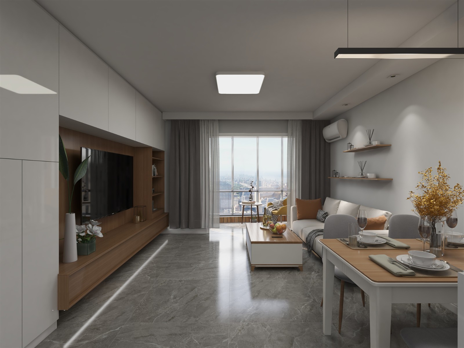 本案是一套二室一厅户型,夫妻二人居住,目前还没小孩;整体风格定位现代简约,以灰色、原木色为主色调,凸显简单大气的视觉空间,给人一种享受宁静生活的居家环境。