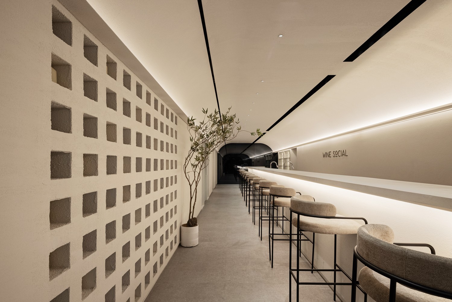 綠植、鏤空牆體和遠端的黑色牆面成為吧台區域的點睛之筆。