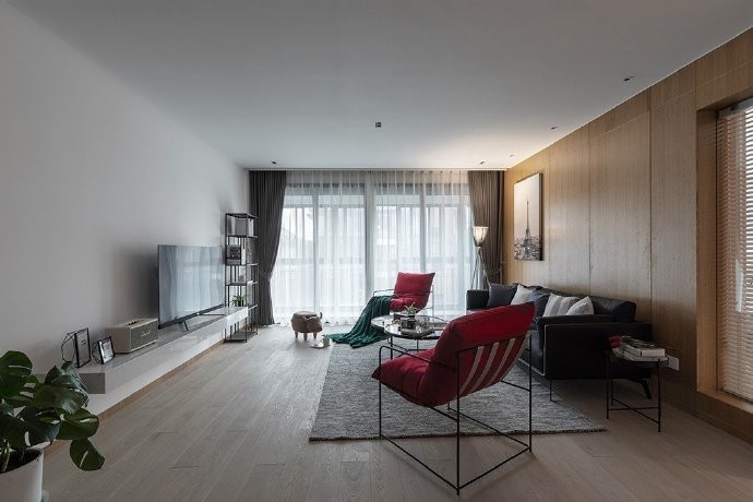 客厅设计了一个大面积的落地窗,增加客厅亮度,同时在明亮的基础上,大胆的使用成熟的颜色,将亮度完美的中和,做到简约不简单