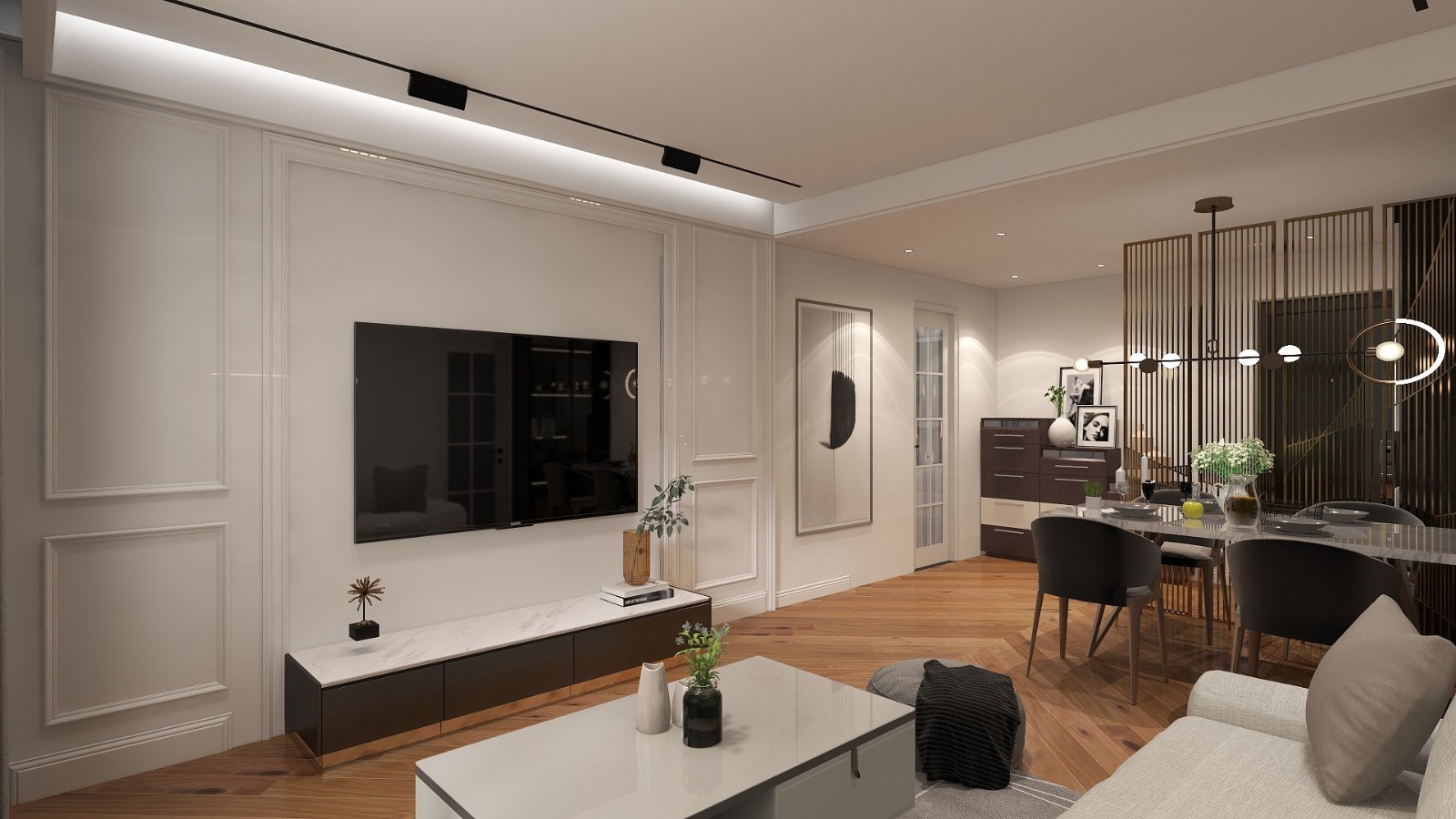 因原户型背景墙在主次卧门中间区域,整体视觉上显得狭窄,因此把主次卧的房门改为隐形门和背景墙做为一个整体