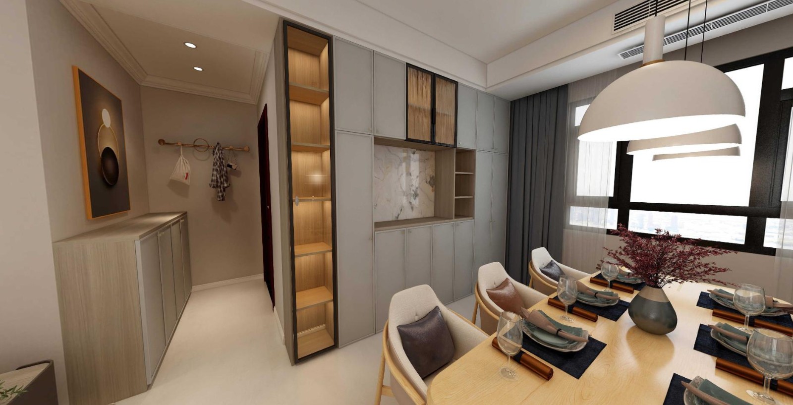 设计师利用吊顶高度差,在视觉上将客厅与过道区域进行了划分,打破了普通平顶的沉闷感。同时把位于过道一侧的儿子房、厨房入口均设计为隐形门,维持着整体墙面的整洁和谐。