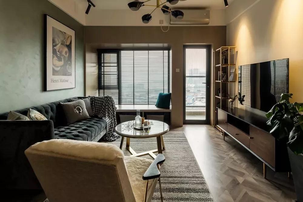▲小小的客厅,沙发墙的绿色与复古调沙发,电视墙的暖色调灯光布置上胡桃木电视柜,整体简约舒适的空间设计,显得大方端庄而又小资情趣
