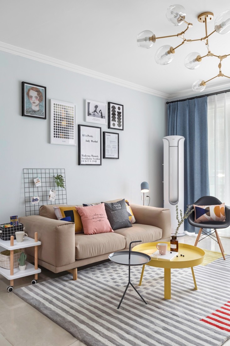 阳光透过窗户洒在沙发上,亮色的茶几像夏日一样明媚活泼。生活就是这样,简单又有色彩。