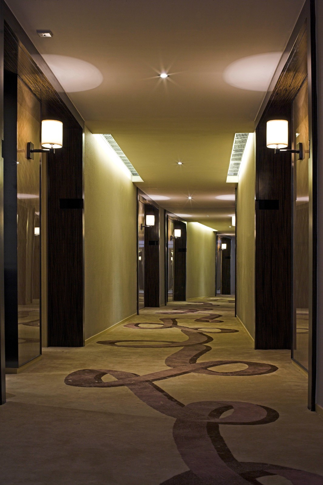 宾馆靠一侧过道,柔软的地毯,暖暖的灯光,温馨宁静。