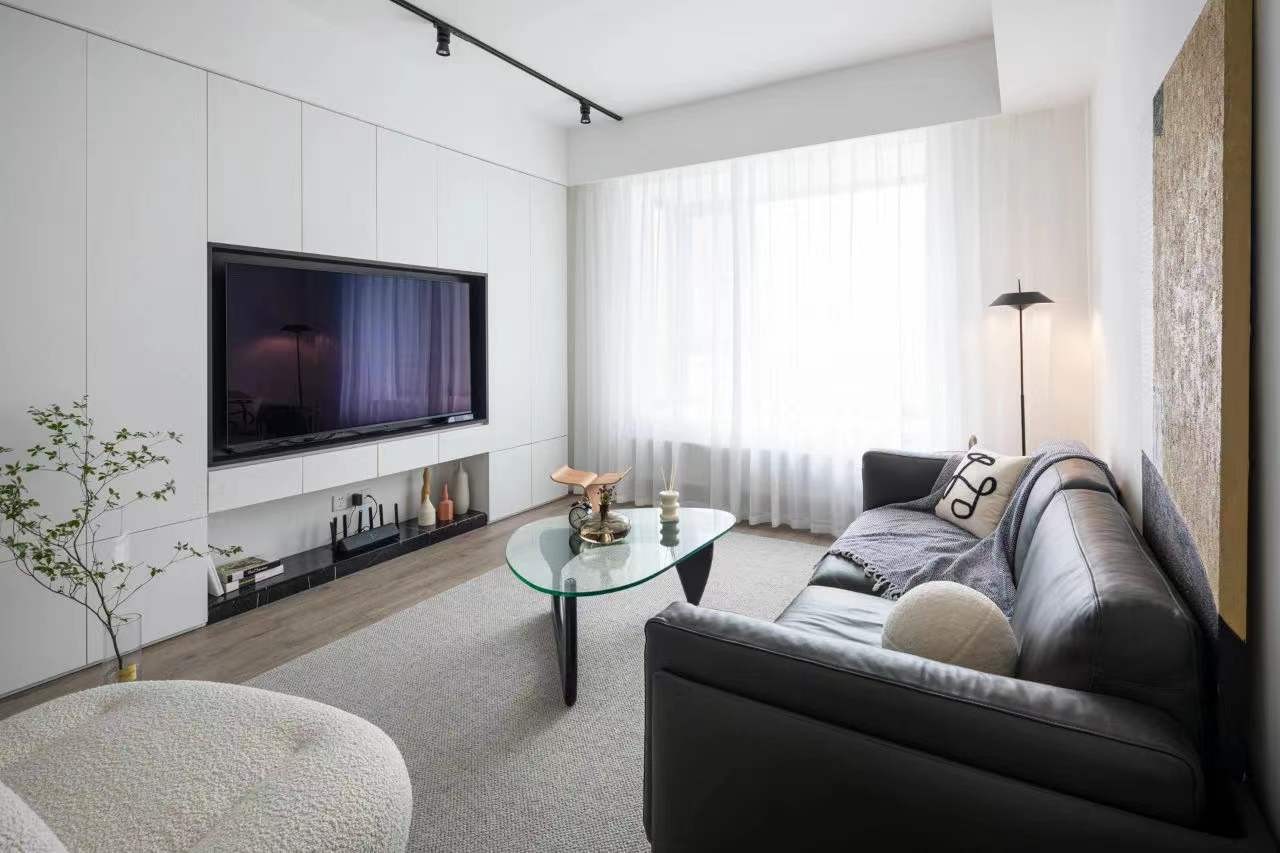电视嵌入墙柜 35公分厚 不宜过厚 地面强化复合地板 温馨实用 顶面明装轨道灯 避免吊顶压抑感