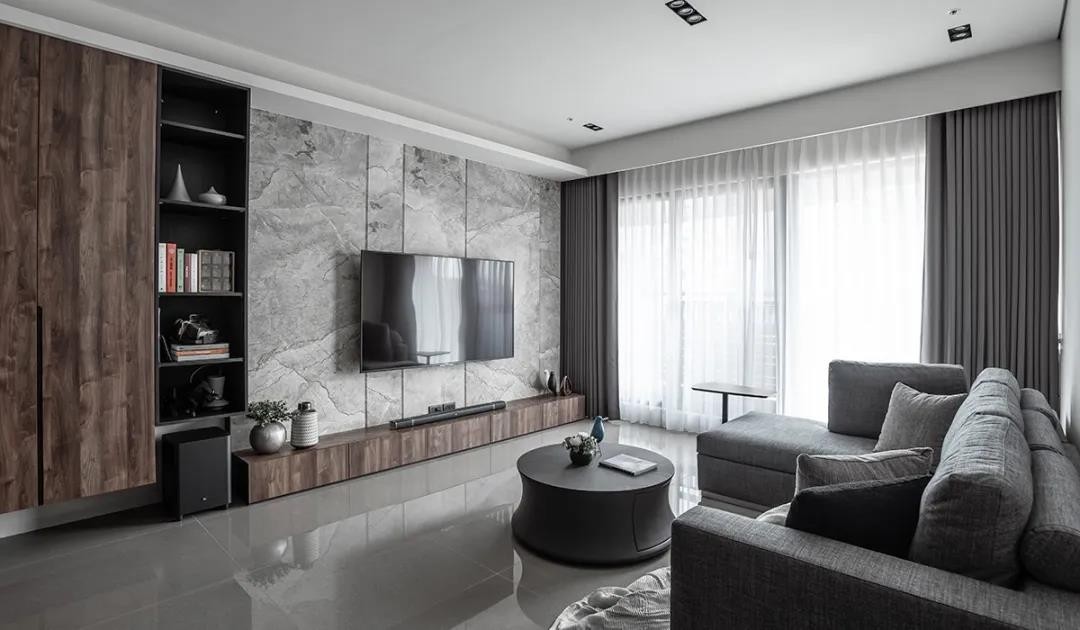 整体以灰为基调,电视背景墙也以大理石材质为背景,与地面相呼应。灰色布艺沙发中和了空间的“高冷感”。