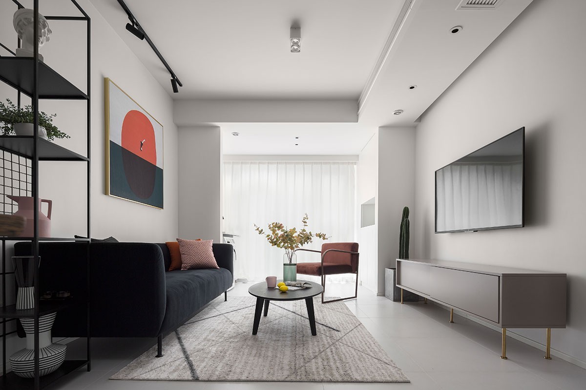 考虑到空间面积偏狭小,因此硬装偏向简约。顶面采用局部吊顶,配合明装射灯、筒灯,更显简洁大气。 没有摆放过多的家具,只选用了轻盈的三人位沙发,单人沙发、铁艺置物架,留出更多的空间自由活动。