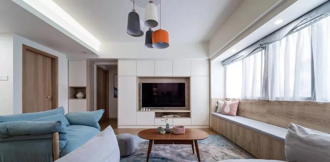 定制整面收纳型电视背景墙,提高客厅储物能力,白+木的设计增添层次感。