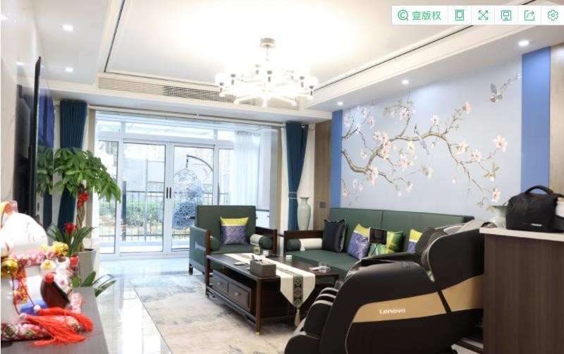 客厅布局井然有序,有着中式的对称美和层次美,沙发背景颇具亮点,以梅花墙布搭配木饰面作为装饰,意境悠远,家居的风格结合了现代家具和古典家具的特质