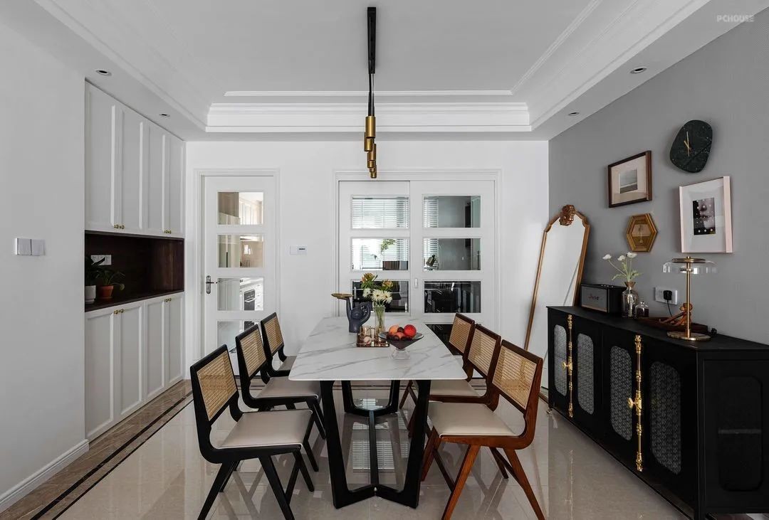 餐厅 餐厅侧面留下来的凹处,利用起来定制了餐边柜,室内踢脚线,也换成了与墙面、柜子同色的白色,整个空间看起来明快了许多。整体空间色彩选用白色,橱柜选用黑色,餐桌选用白色大理石,和黑色铁艺,才对比强烈。用鲜亮的棕色点缀,让这里更具色彩