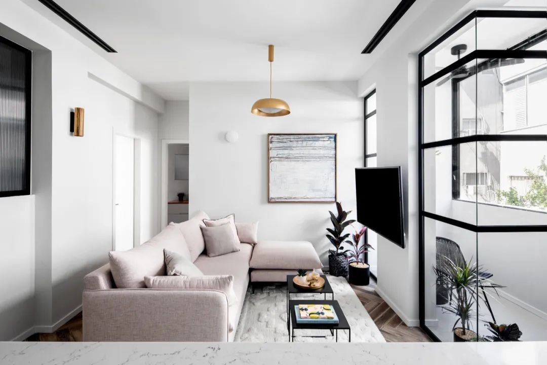 小L型的粉沙发摆放在空间中央,后方预留下一人宽的过道方便行走,利用小装饰品的点缀,来提升室内的丰富度,有精致的黄铜元素、有艺术的画作、有美丽的绿植等焕发出一派美好的景象。