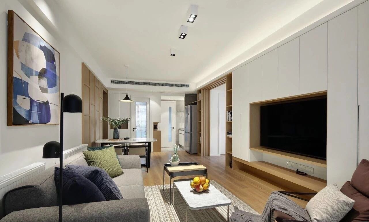 客厅的设计,顶面使用的是白色乳胶漆来装修,没有什么花哨的线条装饰,追求现代简约的整洁、干净之美。