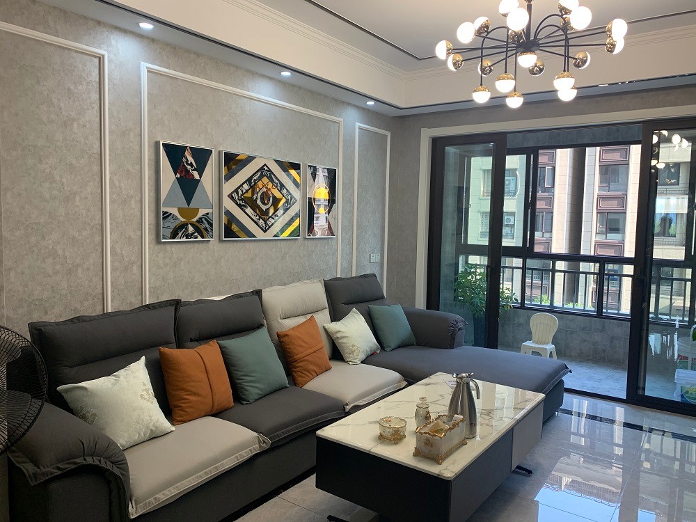 沙发背景墙灰色墙面打底,白色石膏线+挂画做装饰,加上舒适的皮质沙发、方形茶几。