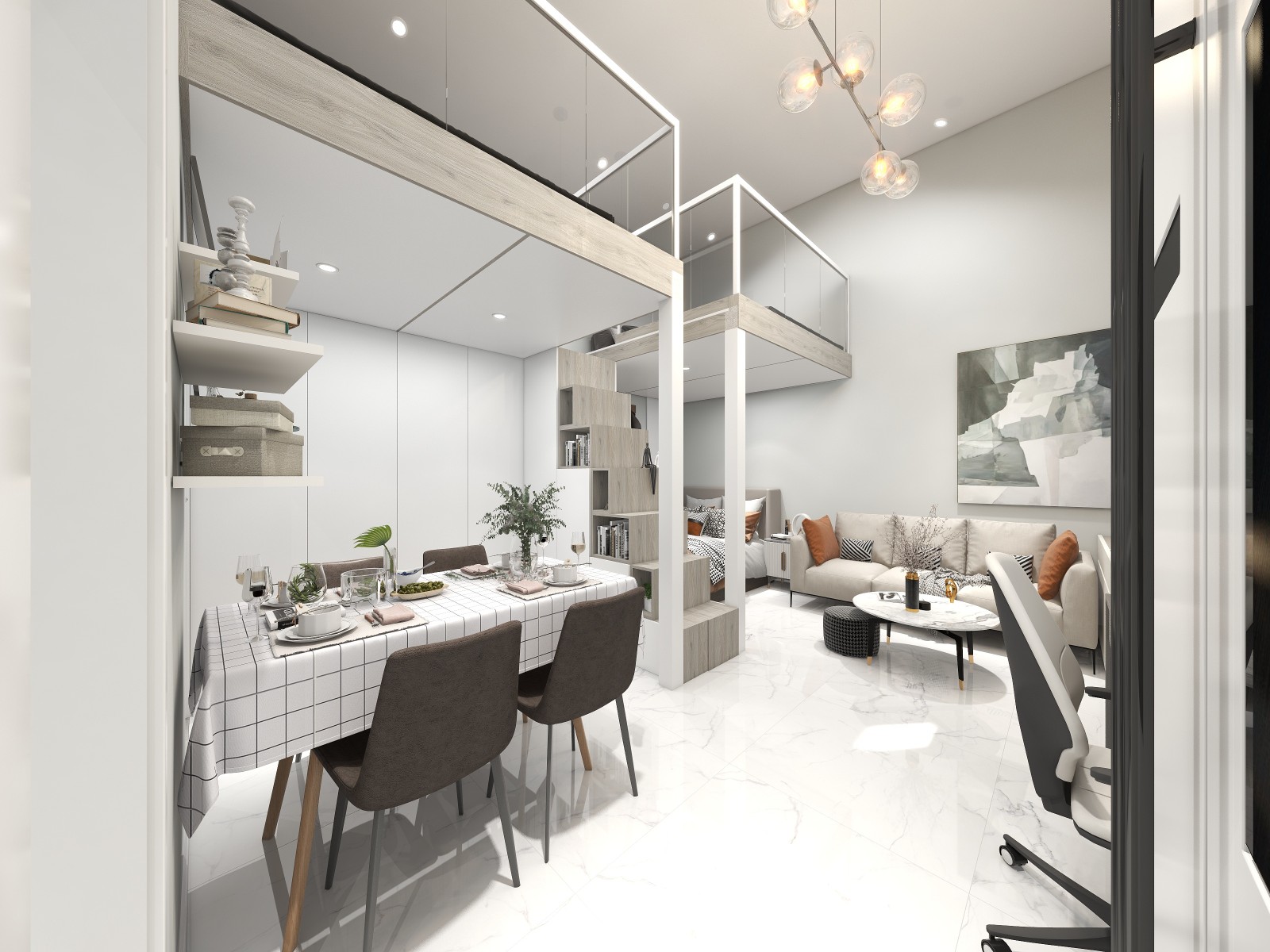 俯视观看角度,顶面筒灯加主灯形式。