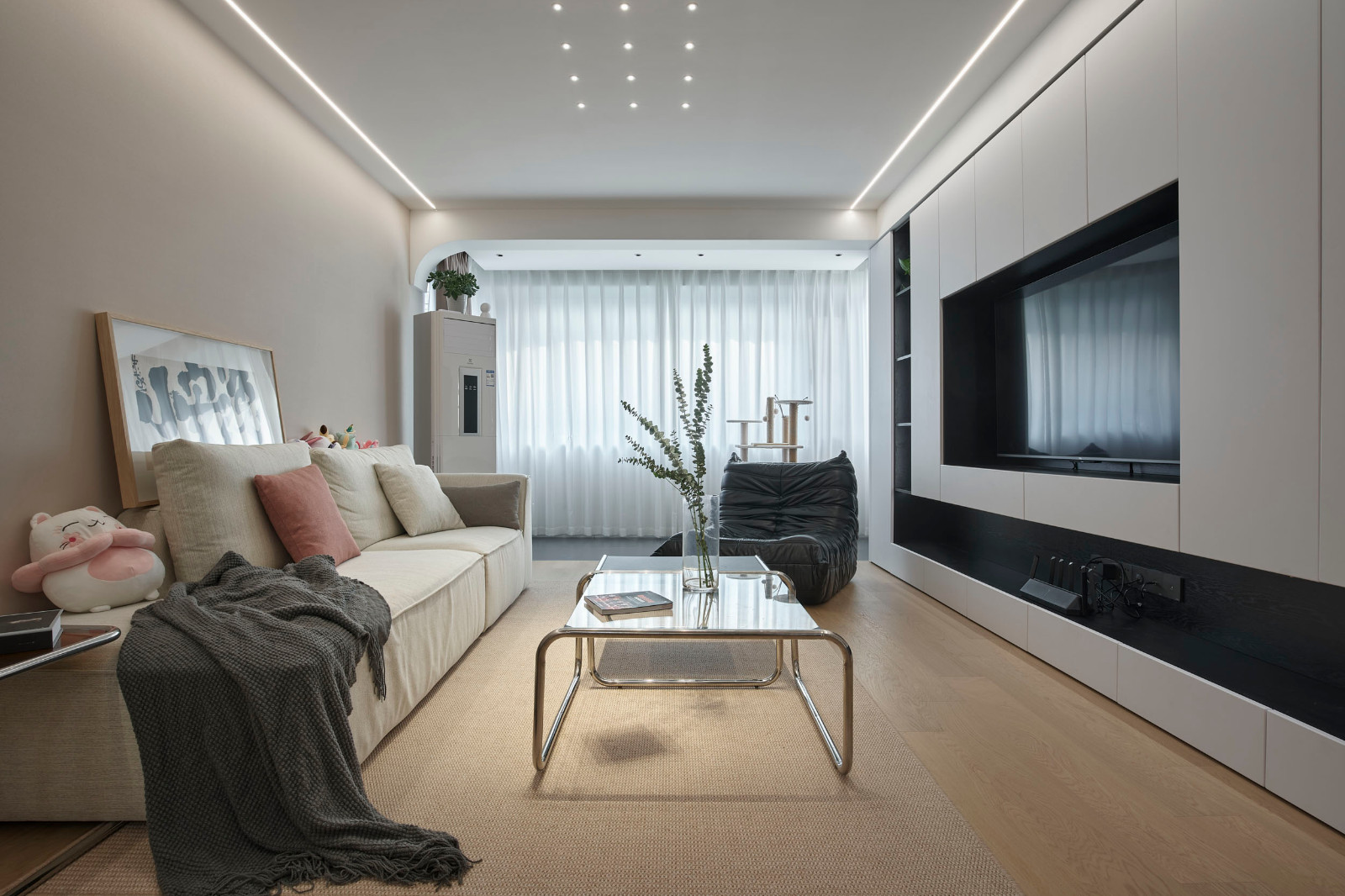 客厅立面运用纯粹色调的简洁美与细腻木纹的亲切感,营造出适宜的温馨感与舒适感。黑白经典撞色,一轻一重,让场域的“生命力”立刻被激活。线性灯搭配均匀分布的“星点”,光而不耀,指引万般美好与你环环相扣。