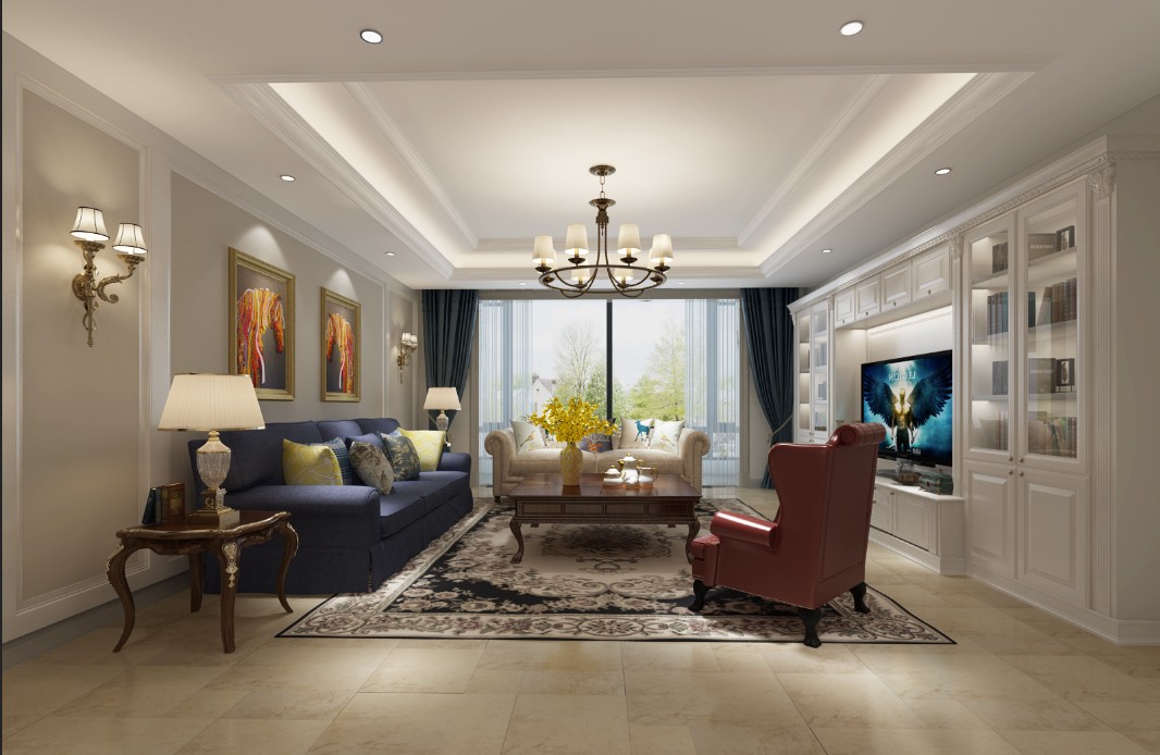 此空间为客厅区域,颜色深浅搭配,既满足中年夫妻二人对稳重的要求,又满足女儿对空间颜值的要求