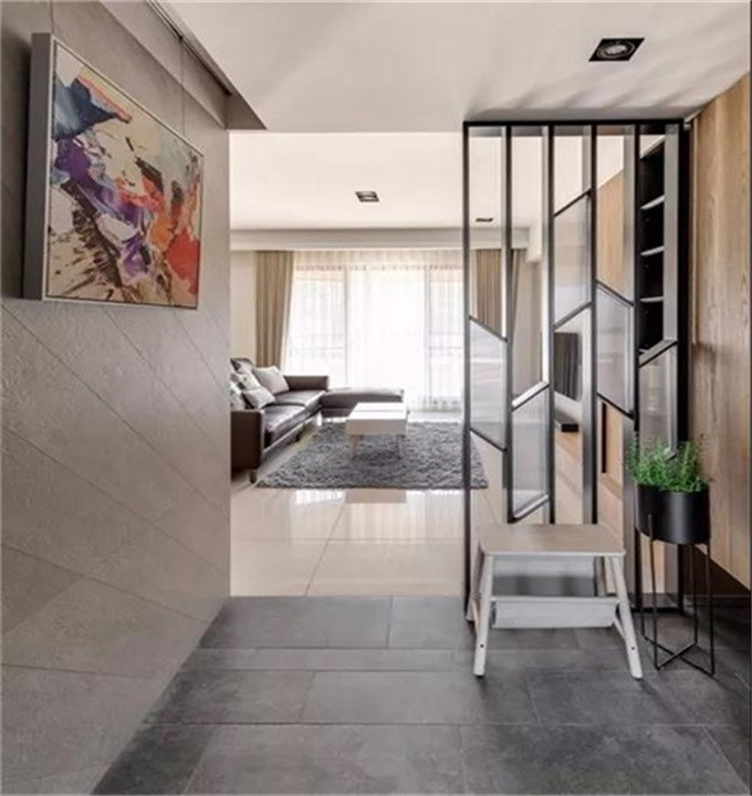 玄关以哑光灰色的地砖,针对大门位置装了一个创意的屏风,布置一张小端景台与盆植点缀,让小玄关也显得清新端庄好惬意。